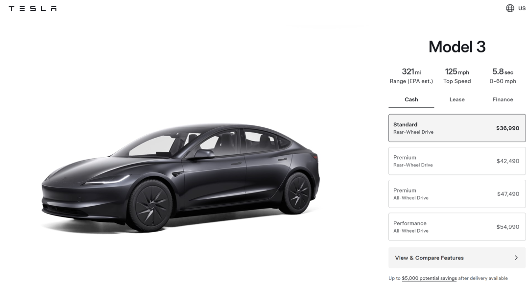 特斯拉官网显示,Model 3 Standard起售价为36990美元(约合人民币26.33万元),相比于目前在售的后驱长续航版(Premium)车型便宜了5500美元。Model Y Standard海外起售价为39990美元(约合人民币28.47万元),相比于目前在手的Model Y高级版后轮驱动版车型价格便宜了5000美元。