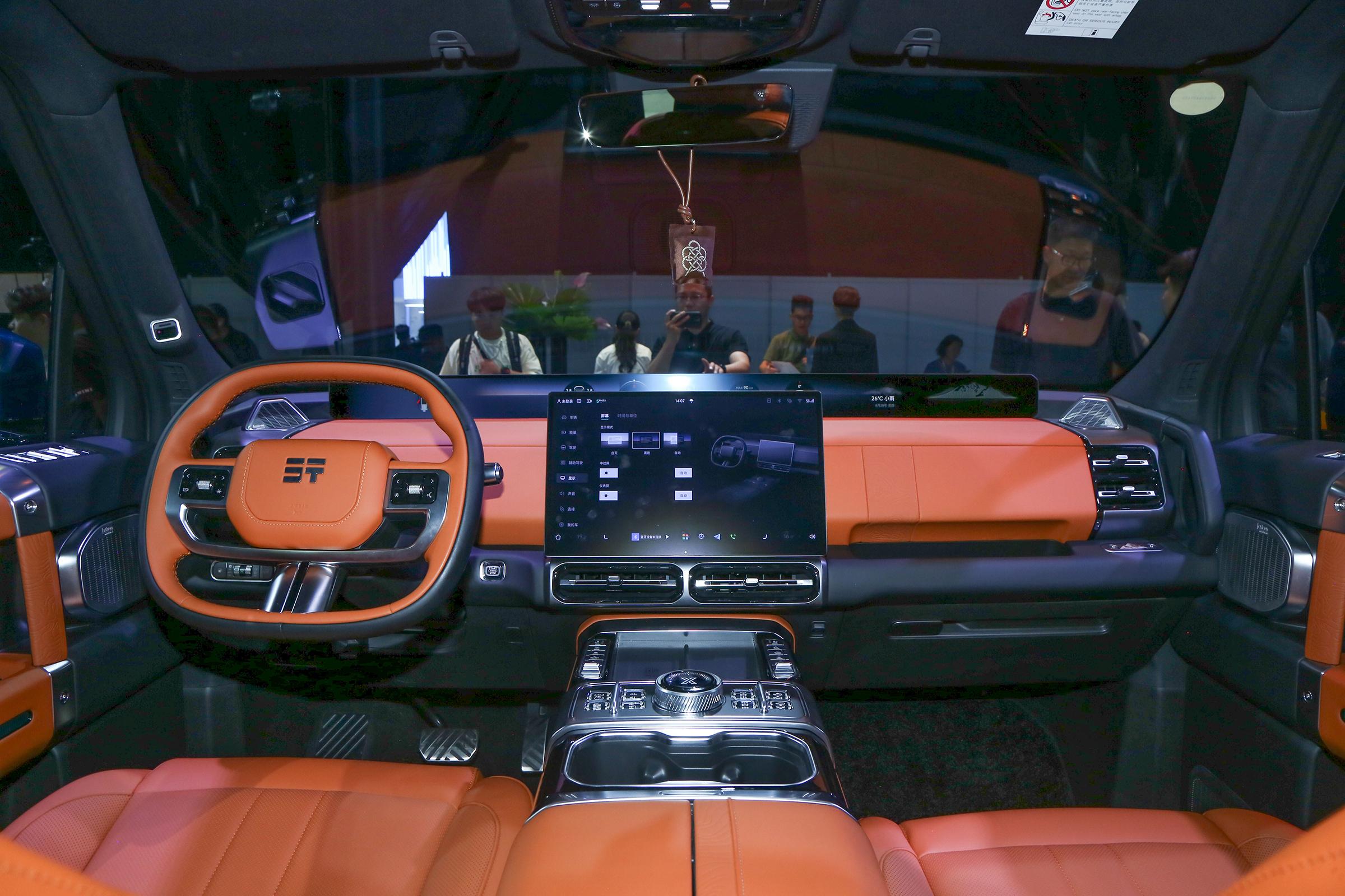 内饰部分,新车车内提供黑/橙、黑/米、黑/灰共3种配色选择,并运用大面积的皮质包裹台面区域,同时还在多处细节融入了镀铬元素进行点缀,呈现出豪华舒适的视觉感受。配置方面,新车提供立体的分层式结构布局,具体来看,新车车内台面顶部配备35.4英寸纵横天际屏,整合了仪表与副驾娱乐功能,中部区域则配备15.6英寸悬浮式中控屏。另外,新车还配备三辐式平底多功能方向盘以及怀挡式换挡杆,整体科技感十足。与此同时,为强化越野属性,新车还配备越野信息显示系统,能实时展示车身姿态、海拔、气压等数据,方便用户更好地操作。辅助驾驶方面,新车中配版本车型搭载猎鹰500智驾系统,顶配版本车型则搭载华为乾崑智驾ADS 4系统。座椅布局方面,新车提供5座和6座两种座椅布局,满足不同需求人群。其中,中高配车型后排配备17.3英寸吸顶娱乐屏和8.88英寸空调屏,形成多屏联动的智能座舱系统。