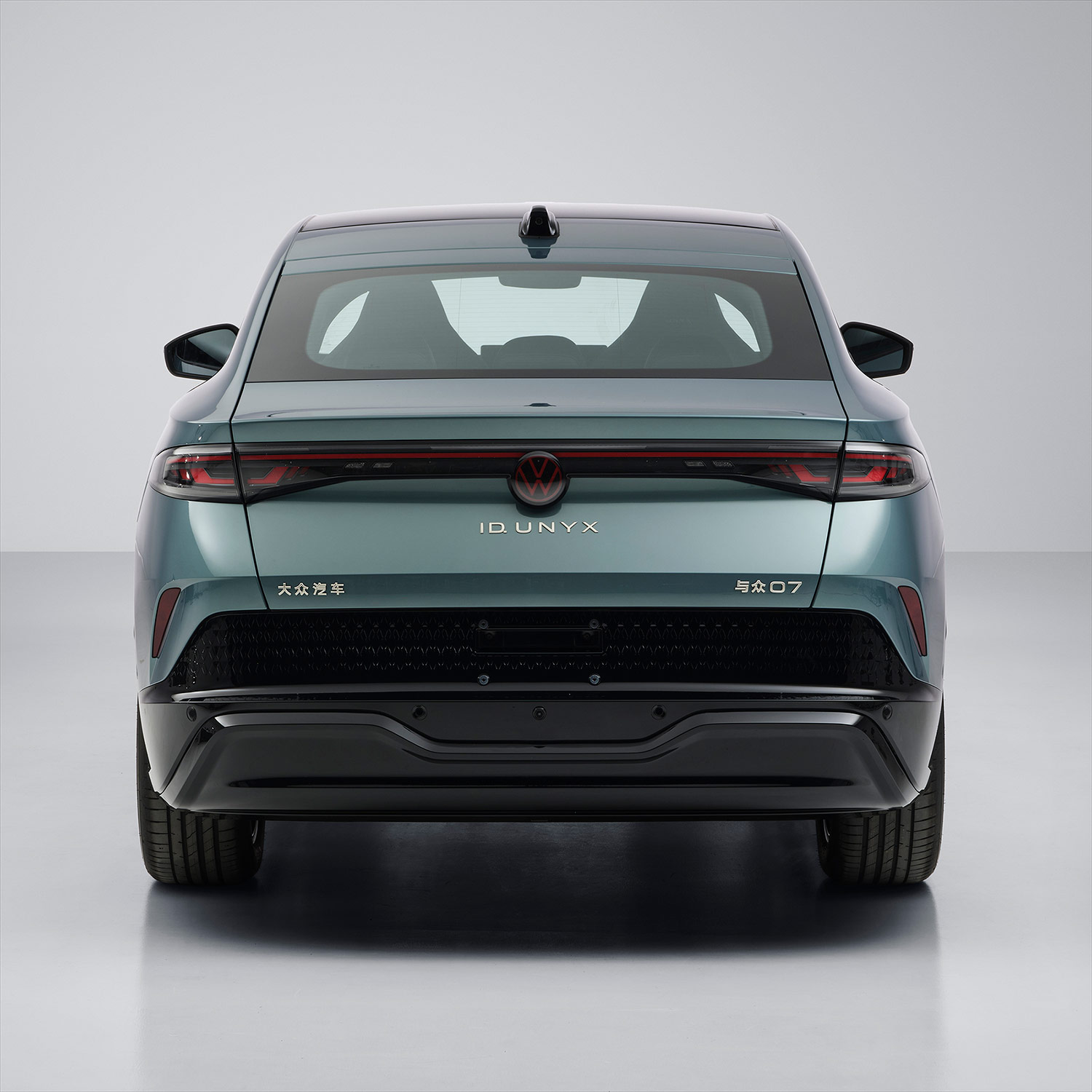 结合实车图来看,与众08基本延续ID. EVO概念车的设计,前脸采用封闭式造型,狭长且上扬的大灯组,配合中央大众品牌LOGO,下包围设计有黑化装饰件,整体延续了大众安徽大胆、前卫、犀利的设计风格。车身侧面,其对A柱进行黑化处理,呈现出悬浮车顶的视觉效果,并配备有车顶行李架,采用密辐式轮圈造型,配合隐藏式车门把手,整体十分时尚。车尾部分,其采用狭长平直的尾灯组,相比车头要相对内敛,配备可发光的红色尾标,下侧为“ID.UNYX”金色标识,尾门右侧“与众08”标识表明身份信息。尺寸方面,与众08的长宽高分别为5000/1954/1672(1688)mm,轴距为3030mm,定位全尺寸SUV,采用五座布局。