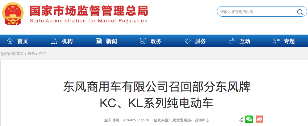 2月12日,国家市场监督管理总局发布最新召回公告。公告显示,克莱斯勒(中国)汽车销售有限公司和东风商用车有限公司两家公司宣布召回部分汽车,前者召回22003辆进口牧马人汽车;后者召回312辆东风牌KC、KL系列纯电动车。