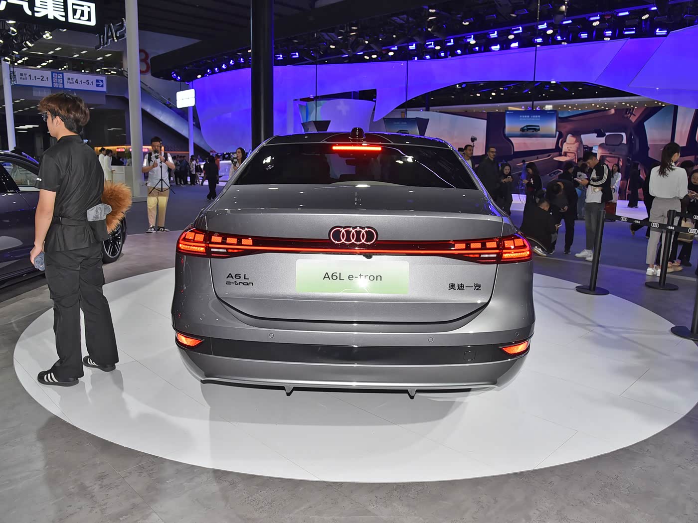 车身侧面,奥迪A6L e-tron配备内嵌式门把手,侧裙位置带有黑色装饰区,提供可收折电子外后视镜。尺寸方面,奥迪A6L e-tron长宽高分别为5073/1942/1522mm,轴距为3076mm。车尾部分,奥迪A6L e-tron上部配备贯穿式OLED尾灯,支持8种可变换样式灯语,当车辆遇到事故或发生故障时,尾灯可以展现出警示的符号,奥迪的LOGO也可以在夜晚发光点亮,车辆下包围区域还带有黑色扩散器包围,彰显运动气息。
