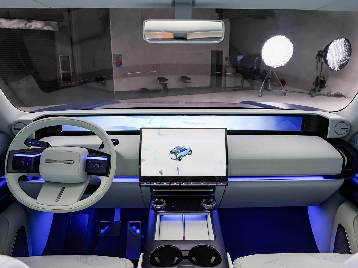 内饰部分,神行者Concept 97采用双层中控台布局,上半部分为贯穿式数字显示屏,下半部分搭载路虎家族风格的三辐式方向盘、悬浮式中控屏,采用怀挡设计。此外,新车中控屏下方保留部分物理按键,中岛区域设计有水晶质感旋钮。