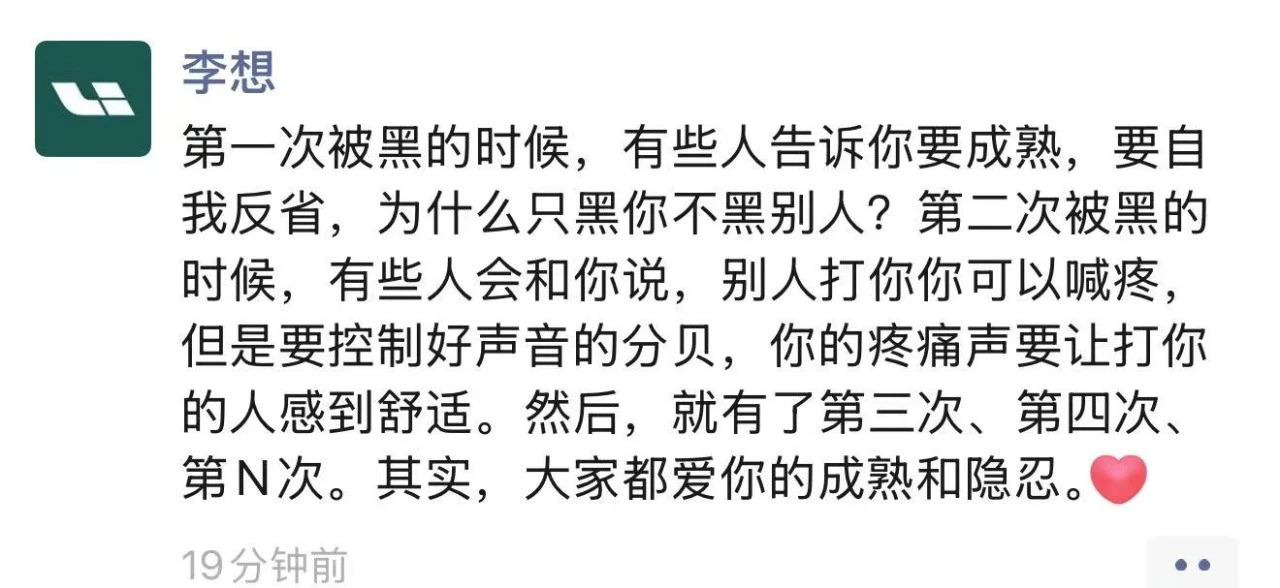 4月12日,理想汽车CEO李想再次针对理想汽车被黑事件发声。其发文称,第一次被黑时,有些人劝他要成熟、要自我反省,“为什么只黑你不黑别人”。第二次被黑时,有些人又建议“可以喊疼,但声音要轻,要让打人的人舒服”。然后,这样的经历却经历了第三次、第四次,直至第N次。“其实,大家都爱你的成熟和隐忍。”相关事件回顾,昨日李想在朋友圈发表了多条谴责黑水军的言论。其发文称,最近某日系品牌大量雇佣“营销号”对理...