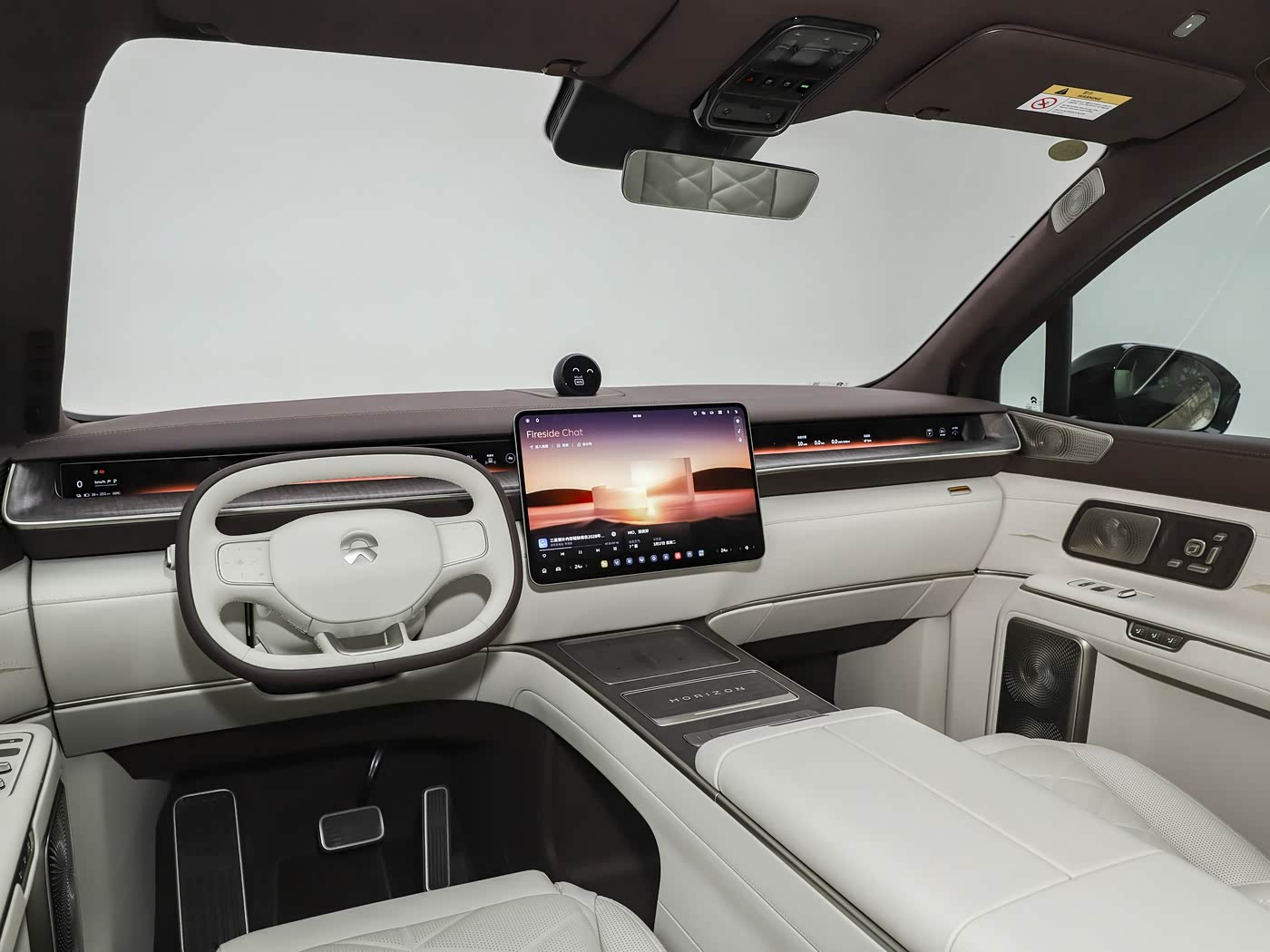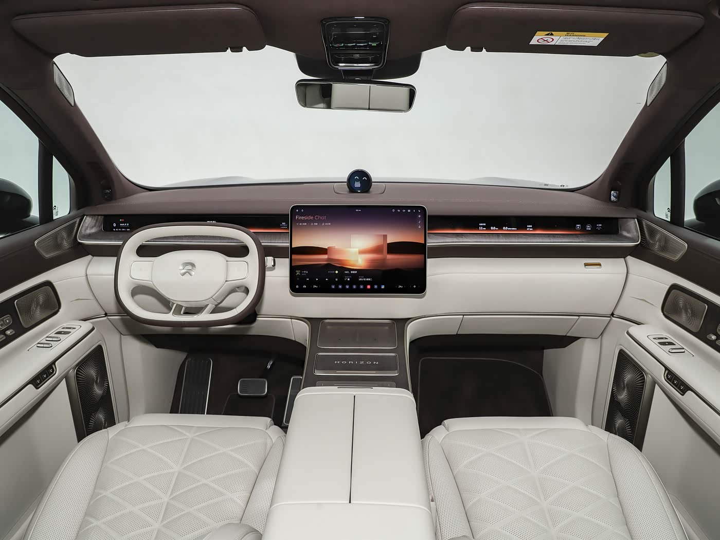 内饰方面,蔚来ES9的内饰设计与蔚来ET9的设计思路高度接近,其中Skyline天际线屏幕可为主驾、副驾同步显示相关行车信息,中央大尺寸悬浮屏将搭载SkyOS·天枢整车全域操作系统,涵盖车控、智驾、座舱、移动互联等全场景,搭配中央NOMI人工智能伙伴,实现便捷交互。车内大面积采用高级真皮材质包裹,车门处配备繁复的扬声器。