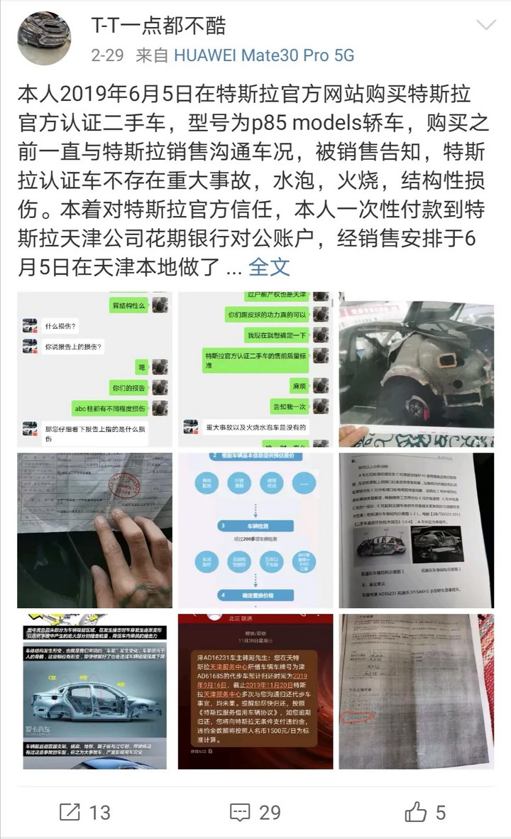 在天津市市场监督管理部门介入调解下,特斯拉也提供了车况说明,该车“无事故或过往事故痕迹”“无结构性维修痕迹”。