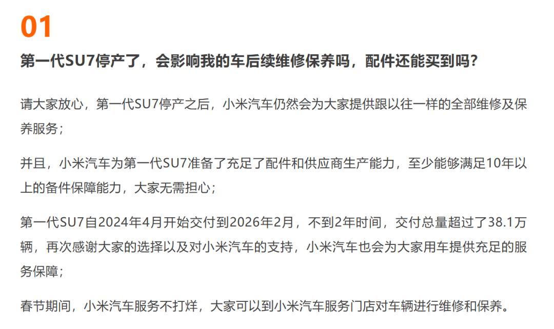 2月12日,小米汽车针对第一代SU7停产后的维修保养服务等问题进行了解答。官方表示,第一代SU7停产之后,仍然会为大家提供跟以往一样的全部维修及保养服务。同时,小米汽车指出已为第一代SU7准备了充足了配件和供应商生产能力,至少能够满足10年以上的备件保障能力。2月10日,小米创始人雷军在直播中曾透露,最后一辆初代小米SU7量产下线,正在运送途中,将安排车主提车。该消息,也意味着小米SU7即将正式停...