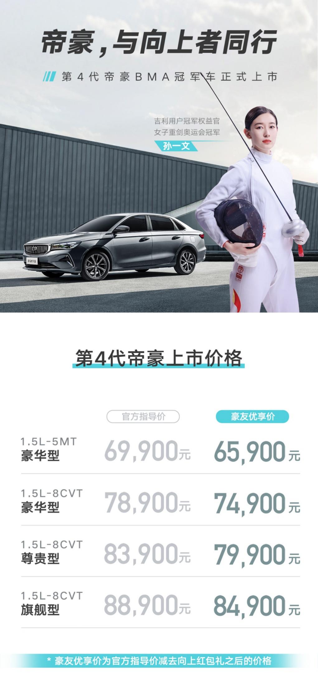 8月28日,吉利汽车在“帝豪,与向上者同行——吉利第4代帝豪BMA冠军车正式上市”直播活动中宣布:中国品牌轿车领军者吉利第4代帝豪正式上市。新车共推出1.5L-5MT和1.5L-8CVT两种动力组合共4款车型,官方指导价为6.99-8.89万元(享受向上红包礼后6.59万-8.49万元)。另外,此次发布会也是全球首个有用户参与的“一镜到底”上市发布会,吉利用户冠军权益官孙一文(女子重剑奥运会冠军)、吉利用户冠军见证官李娜(女子重剑奥运会冠军)两位奥运冠军也倾情助力。